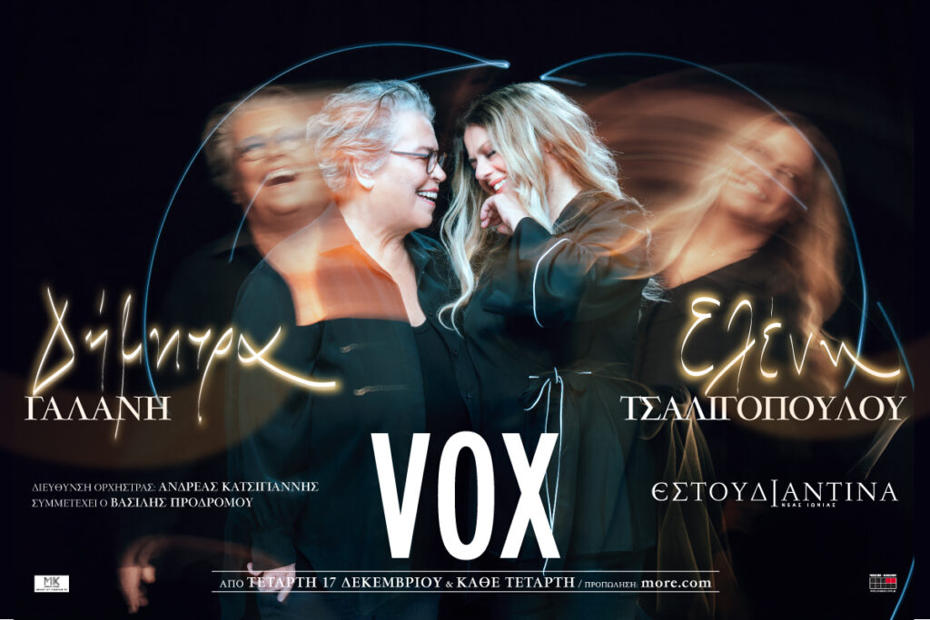 | ΔΗΜΗΤΡΑ ΓΑΛΑΝΗ – ΕΛΕΝΗ ΤΣΑΛΙΓΟΠΟΥΛΟΥ ΕΣΤΟΥΔΙΑΝΤΙΝΑ ΝΕΑΣ ΙΩΝΙΑΣ ΒΟΛΟΥ Διεύθυνση ορχήστρας: Aνδρέας Κατσιγιάννης Συμμετέχει ο Βασίλης Προδρόμου Από Τετάρτη 17 Δεκεμβρίου και κάθε Τετάρτη στο VOX Δύο από τις σημαντικότερες ερμηνεύτριές μας και μία θαυμάσια ορχήστρα σε μία μουσική παράσταση γεμάτη από τη ζεστασιά και την οικειότητα των τραγουδιών και των φωνών που αγαπάμε. Μία συνάντηση που υπόσχεται έναν ξεχωριστό μουσικό χειμώνα! Από την Τετάρτη 17 Δεκεμβρίου και κάθε Τετάρτη στη σκηνή του VOX, η Δήμητρα Γαλάνη συναντά ξανά την Ελένη Τσαλιγοπούλου, τον Βασίλη Προδρόμου, από τη νεότερη γενιά ερμηνευτών, και την ιστορική Ορχήστρα Εστουδιαντίνα Νέας Ιωνίας Βόλου. Οι δύο ερμηνεύτριες μας μιλούν για τη νέα τους συνεργασία: «Μας δένει μια μακρά πορεία μέσα στο τραγούδι. Από το ’93, με αφετηρία το πάντα αγαπημένο και αλησμόνητο “Χάραμα”, έχουμε σταθεί πολλές φορές μαζί στη σκηνή κι εκεί γεννήθηκε μια βαθιά αλληλεπίδραση — ένα βλέμμα, μια νότα, μια κοινή αίσθηση για το τι σημαίνει να ζεις τη μουσική. Αυτή τη φορά, σε αυτό το νέο μας «δέσιμο», έρχεται να προστεθεί και ο Βασίλης Προδρόμου — ένας υπέροχος και αγαπητός σε όλους μας τραγουδιστής – τραγουδοποιός και μουσικός, με σεβασμό, ψυχή και αληθινή αγάπη για το τραγούδι. Ένας καλλιτέχνης της γενιάς του που έχει πολλά να δώσει και να μοιραστεί μέσα από τη φωνή και την παρουσία του. Μαζί μας και η ορχήστρα Εστουδιαντίνα Νέας Ιωνίας – με τους εξαιρετικούς σολίστες της, μια ορχήστρα που αγαπάμε πολύ και που φέτος κλείνει 30 χρόνια δημιουργικής παρουσίας υπό την διεύθυνση του Ανδρέα Κατσιγιάννη, έχοντας αφήσει το δικό της σημαντικό ίχνος στην ελληνική μουσική. Δίπλα μας και δύο υπέροχοι μουσικοί, ο Σπύρος Χατζηκωνσταντίνου και ο Σεραφείμ Γιαννακόπουλος, που βάζουν τη δική τους σφραγίδα με τρόπο μοναδικό. Φέτος, όλοι εμείς, συναντιόμαστε για πρώτη φορά επί σκηνής. Μας ενώνουν κοινές αγάπες για το τραγούδι που κουβαλά ιστορίες, για τις ρίζες που μας συγκινούν, για τη μουσική που κρατά ζωντανό ό,τι αγαπήσαμε. Η Δήμητρα έρχεται από τον κόσμο του Τσιτσάνη και του λαϊκού τραγουδιού, με εκείνη την ευγένεια και τη γνώση που κουβαλά όποιος έχει μελετήσει σε βάθος αυτή τη μουσική. Η Ελένη, από τον κόσμο της παράδοσης και του σμυρναίικου τραγουδιού, με ρίζες που ακουμπούν στη Μικρά Ασία, εκεί όπου πάλλεται η καρδιά του τραγουδιού από τον καημό και τη γλύκα. Μαζί, γινόμαστε μια μεγάλη μουσική παρέα, που «πειράζει» τρυφερά την παράδοση, αγκαλιάζει όλο το φάσμα του ελληνικού τραγουδιού ως το σήμερα και αφήνει χώρο για το απροσδόκητο και την έκπληξη. Ετοιμαστείτε για έναν χειμώνα γεμάτο υπέροχα τραγούδια, παρέα με τον Διόνυσο και τη χαρμολύπη, που τόσο έχουμε ανάγκη. Γιατί τα τραγούδια μάς κάνουν καλύτερους ανθρώπους.» Δήμητρα Γαλάνη – Ελένη Τσαλιγοπούλου |